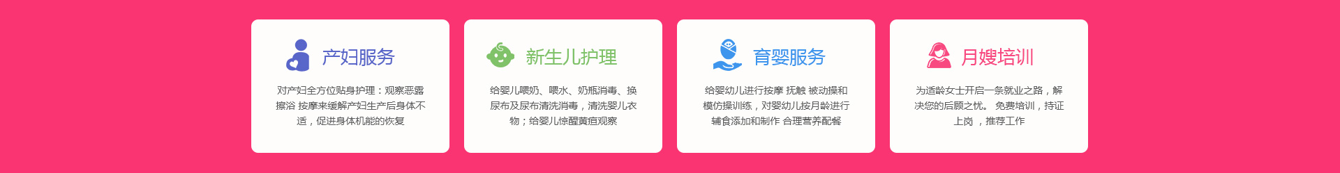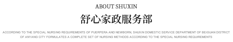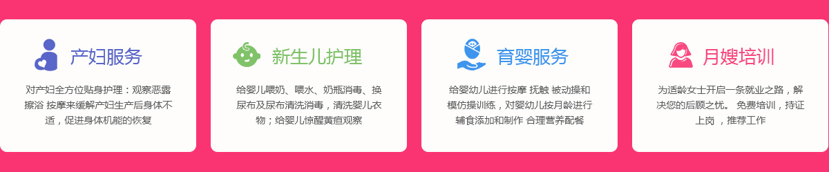 關(guān)于我們 產(chǎn)婦服務(wù) 新生兒護理 育嬰服務(wù) 月嫂培訓(xùn) 催乳師培訓(xùn) 舒心家政 月子餐 資質(zhì)榮譽 服務(wù)案例